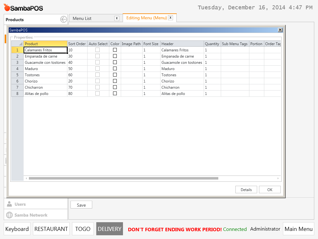 Manage > Products > Menu List > Menu > Edit Product Properties