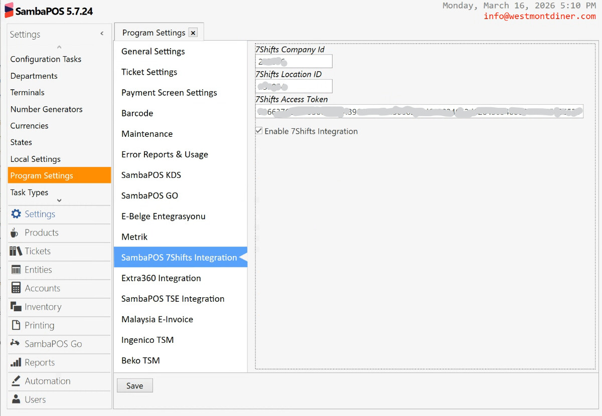 Hello I am following the 7shifts integration from the KB 6.45. 7Shifts Integration – SambaPOS Knowledgebase