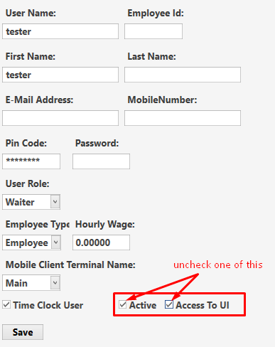When save is clicked, if “Inactive” checkbox is checked, set Pin Code = some random string and Password = null.