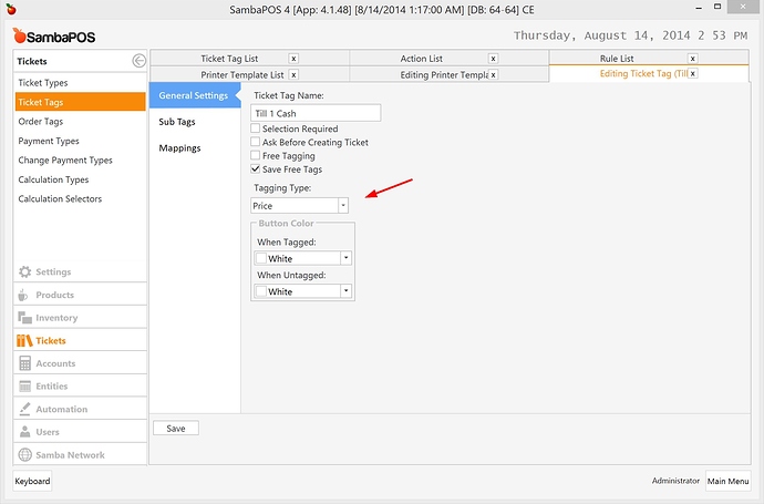 I’ve added two ticket tags. Till 1 Cash and Till 2 Cash. Tagging Type should be Price. Since I don’t want to see buttons for these tags I won’t create mappings.