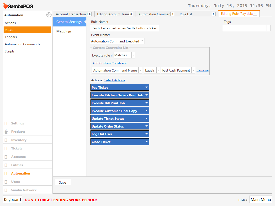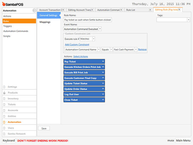 Ideally you’ll only have Pay Ticket, Print Customer Ticket & Close Ticket actions here.