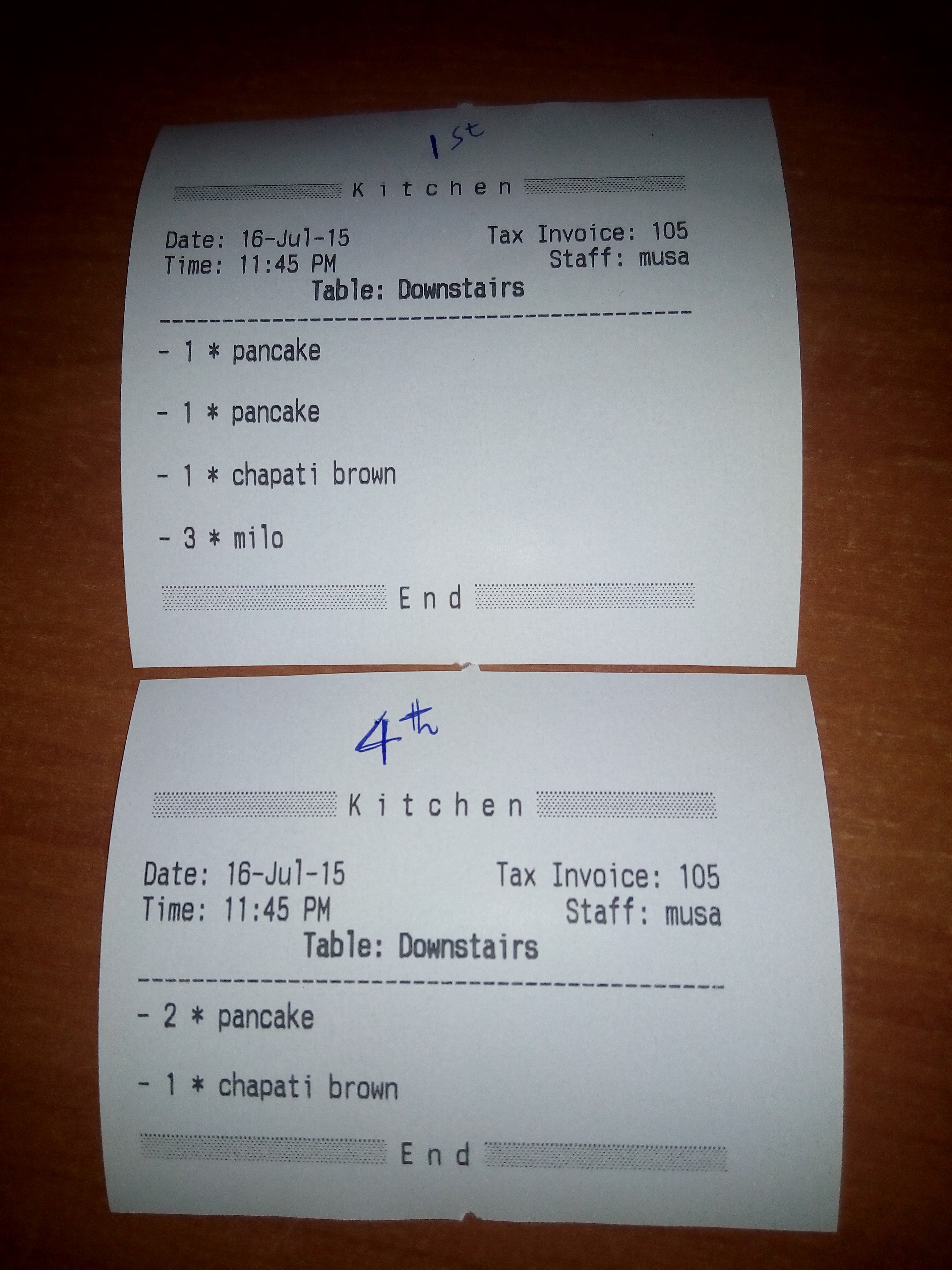I think i have combed through all the sections to no avail but also I do not know my way well around the system. I am in the process of learning. Anyway, when I click on single menu items (i.e., no repeated menu items or incremented) it prints as it should. If in the example above I just clicked on 1 pancake and 1 milo there would be no issue.