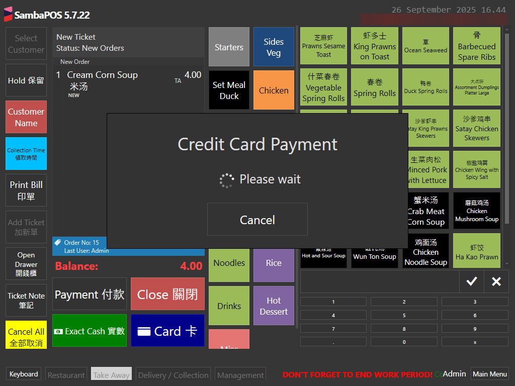 It just sticks at “Please wait…” on SambaPOS when sending to the card machine. Previously it would show other steps like “Transaction started”, “Present card”, etc.