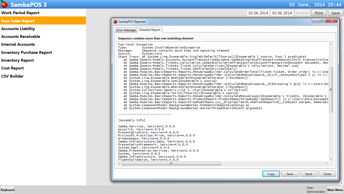 at Samba.Modules.BasicReports.Reports.MenuGroupBuilder.<CalculateMenuGroups>b__9(IGrouping`2 grp) in c:\Users\Emre\Documents\GitHub\SambaPOS-3\Samba.Modules.BasicReports\Reports\MenuGroupBuilder.cs:line 15