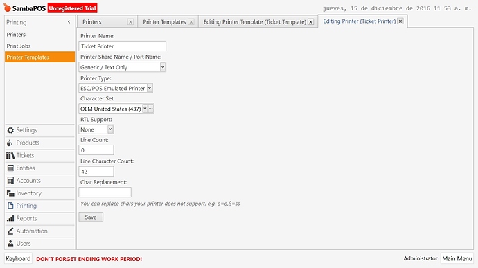 And show your SambaPOS Printer config and Print Job as well as the Template.