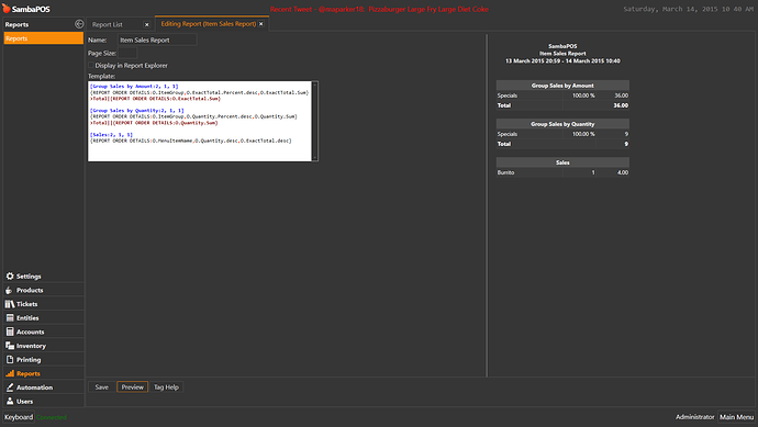 Are you referring to the Item Sales report? This is not a Sales Report it is specifically Item Sales. If not which sales report are you referring too because the only other sales report is the Work Period report.