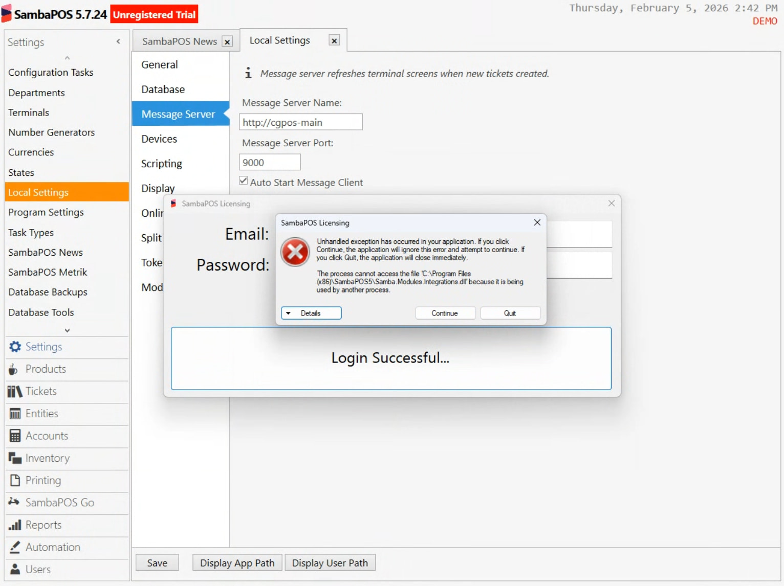 When next booted I got an invalid licence message popup on the login screen, the messaging server was connected.