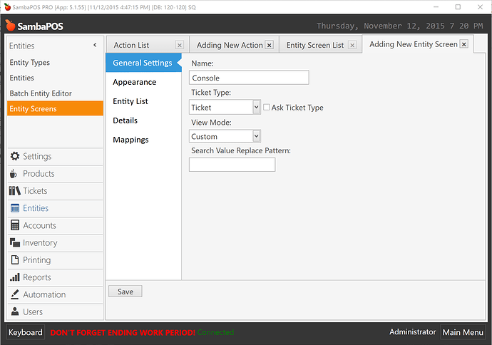 I’ve created a new entity screen called Console. Mapped it as regular.