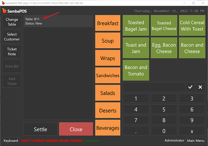 Typing B11 and clicking OK button creates a new ticket and assigns B11 table.