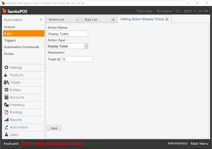 Created another action that displays new ticket on screen. Ticket Id should be 0.