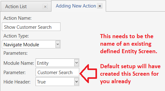 Alternately, if you want the default Search Screen to appear, you can create an Action to Navigate to Entity Search, and have your Automation Command fire that Action instead…