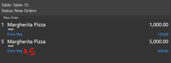 The values displayed are correct. Each individual pizza has 1x Extra Veg, not 5.