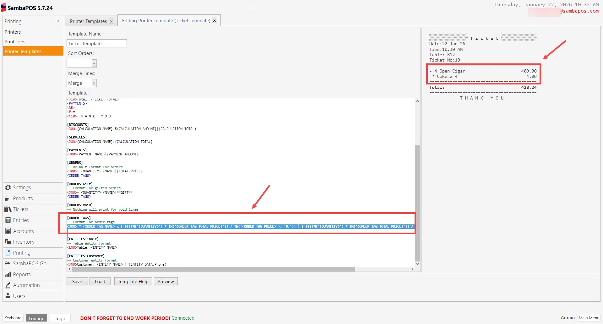 * {ORDER TAG NAME} x [=F((TN(‘{QUANTITY}’) * TN(‘{ORDER TAG TOTAL PRICE}’)) / TN(‘{ORDER TAG PRICE}’), ‘0.’)] | [=F((TN(‘{QUANTITY}’) * TN(‘{ORDER TAG TOTAL PRICE}’)) / TN(‘{ORDER TAG PRICE}’), ‘0.00’)]