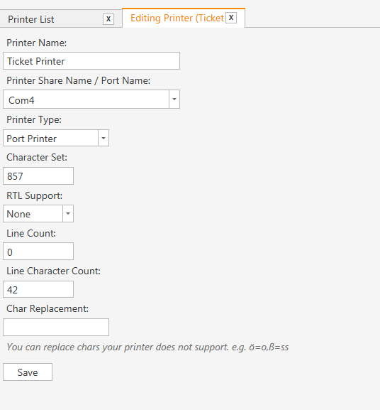 Install windows driver for your printer, select Ticket Printer and choose your printer name from the combobox instead of typing Com4