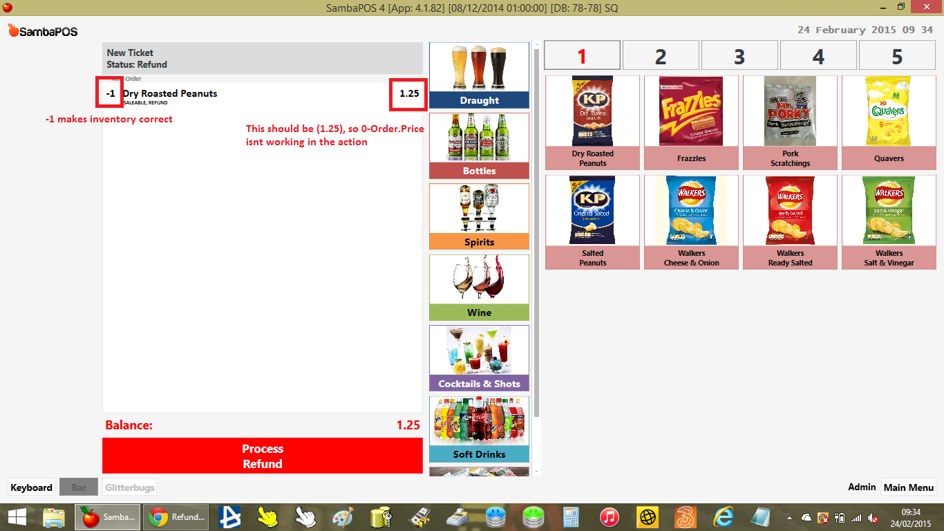 i now get it to show as -1 and the price is minus, when processing the refund the cash values in account are now correct but inventory still hasnt updated.