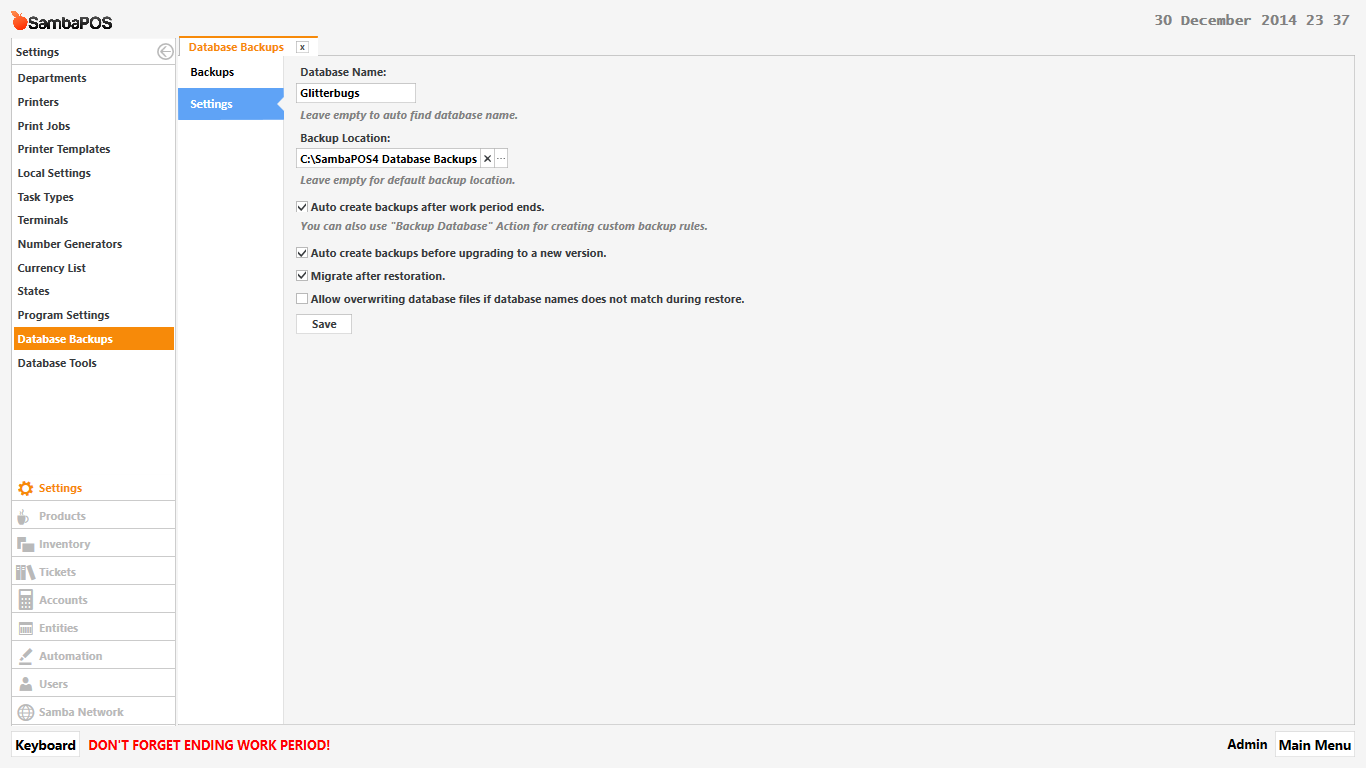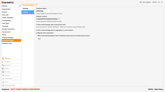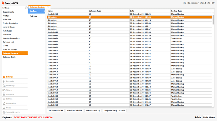 In the first screenshot abovein the database name field. Normally this is blank so defaults to SambaPOS4, i made some changes and then backed up the database using the name Glitterbugs.