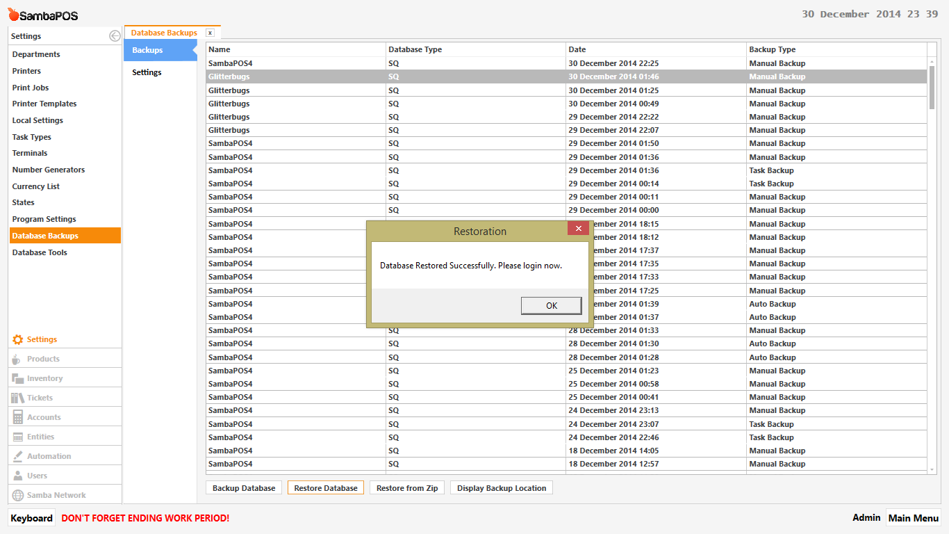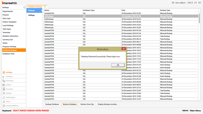 But when i try to restore the Glitterbugs database it says successful but nothing changes when logging in, its the same as the SambaPOS4 databases even though ive made changes and backed up using the Glitterbugs name
