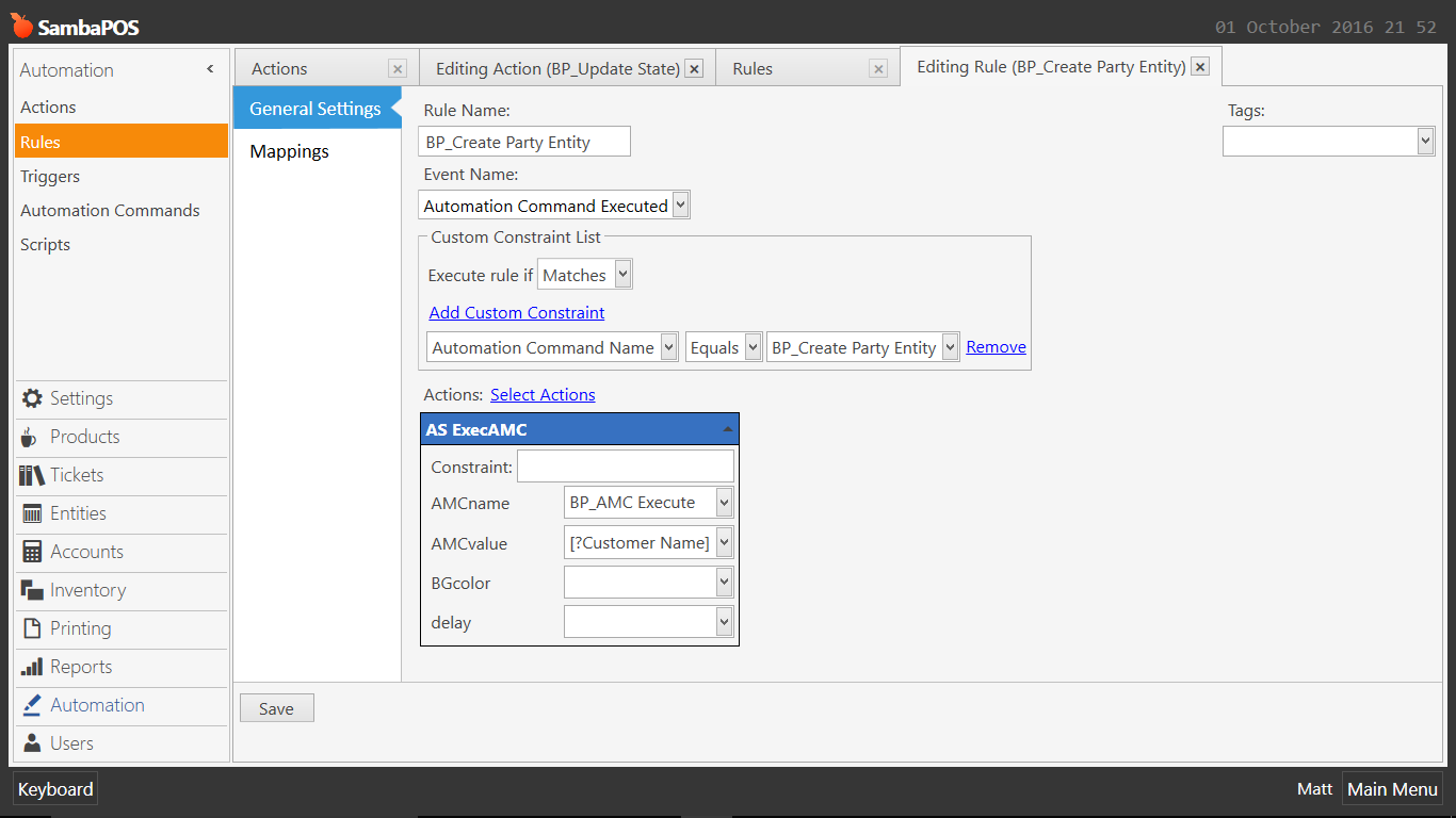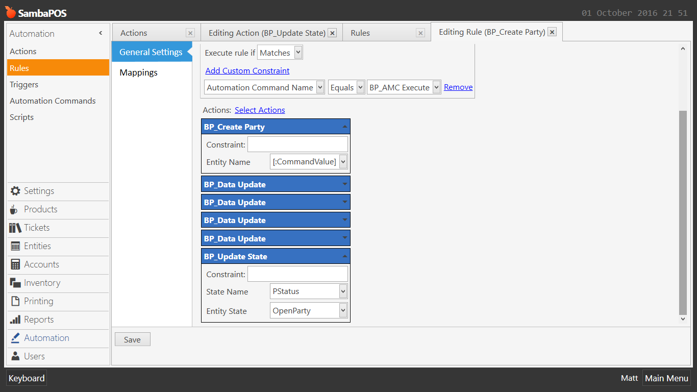 Show the Rule/Action(s) where you create the Entity, and where you update the Entity Data.