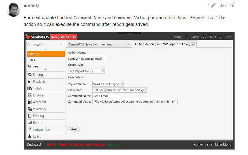 am not sure whether am damn or whether the latest version supports Email being sent after work periods ends ,i have struggled with sending emails for some few days now ,whenever am close to achieving it i get continuous emails being sent a million times .Something that JTRTech called command loop.