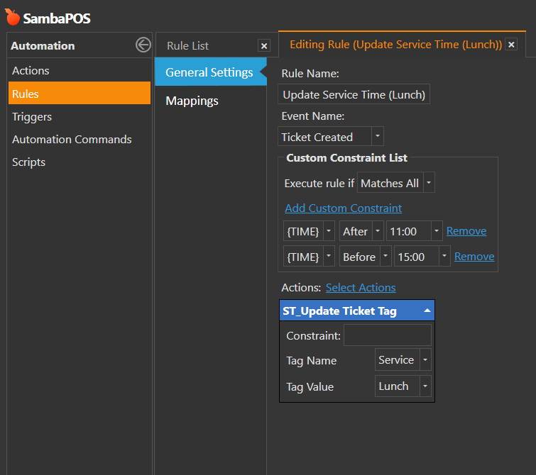 I used three rules for Breakfast,Lunch, and Dinner the rules are all setup the same the difference is the {Time} constraint to designate what time you want this tag. Also you would set appropriate Tag Value for the service aka Breakfast, Lunch, or Dinner