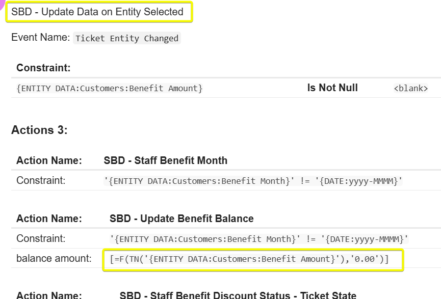 3 new custom fields will be added to an entity type. This setup is looking for a value in what is called a “Benefit Amount” field. If found, it will check the “Benefit Month” if it set to the current month format. If not set to the current month, it will adjust the “Benefit Month” and the “Benefit Balance” the the proper values. Any “Benefit Balance” that is left, will be written over, the staff member will lose the previous months “Benefit Balance” amount.